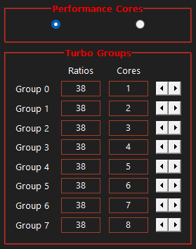 Частоты регулируются в разделе FIVR › Turbo Groups, переключатель P/E ядер – сразу над ним. В левом столбце задаётся множитель базовой частоты шины 100 МГц (например, 38 = 3,8 ГГц). В правом столбце задаётся число активных ядер, при которых актуален этот множитель. В самом простом сценарии можно ввести везде одинаковый множитель и получить стабильную частоту.